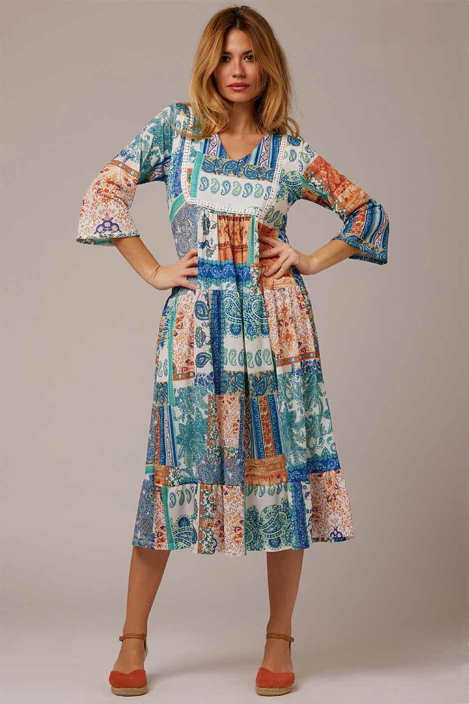 Vestido boho en tejido elástico con volantes, pasamanería y estampado pasley